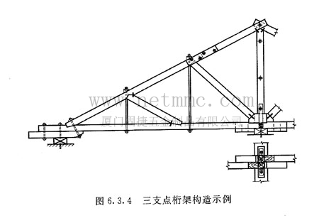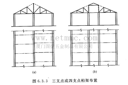 四支點桁架中的兩榀單坡桁架應(yīng)放置在同一垂直平面內(nèi),而在中部兩根立柱上放置一個小三角架(圖6.3.3b及圖6. 3. 5)。