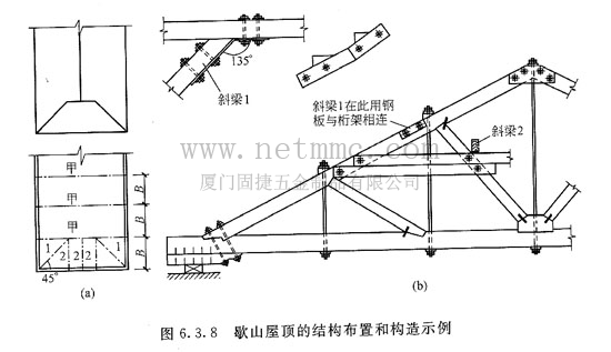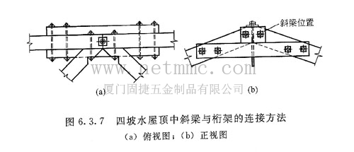 設(shè)計中尚應(yīng)注意使斜梁頂面的標(biāo)高與三角形桁架的上弦取齊。其連接方法見圖6.3.7。
