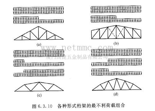 求桁架桿件內(nèi)力時(shí),恒荷載(包括自重)按全跨分布?;詈奢d除按全跨分布外,尚應(yīng)根據(jù)各種桁架的受力特點(diǎn),分別按可能出現(xiàn)的不利分布情況進(jìn)行組合。例如:三角形桁架在半跨活荷載(包括懸掛吊車)作用下(圖6. 3.10a),中間一對斜腹桿的內(nèi)力不同,而下弦中央節(jié)點(diǎn)處的連接物必須按其水平分力差進(jìn)行核算;梯形桁架在半跨活荷載作用下(圖6.3.10b),中間腹桿內(nèi)力可能變號;多邊形桁架或弧形桁架可能在3/4跨及1/4跨(或2/3跨及1/3跨)活荷載的組合下(圖6. 3. 10c、d),某些腹桿的內(nèi)力達(dá)到其最大值。