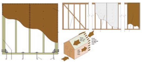 4、經(jīng)工程設(shè)計建造的木框架建筑,其結(jié)構(gòu)用面板(膠合板或定向刨花板)與墻骨柱組成有效的抗側(cè)向力的建筑組件。