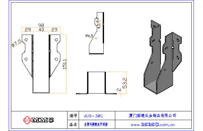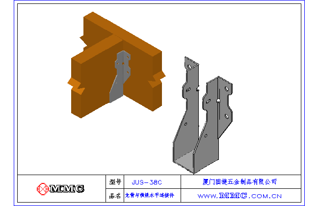 MMC連接件系列,適用于38-40MM的龍骨與橫梁間的連接,廣泛應用于各種木屋、木棧道、花架、涼亭等木結構建筑,用于2*8(38*184)的梁的托掛連接件,木屋連接件