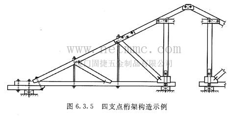 四支點桁架中的兩榀單坡桁架應(yīng)放置在同一垂直平面內(nèi),而在中部兩根立柱上放置一個小三角架(圖6.3.3b及圖6. 3. 5)。
