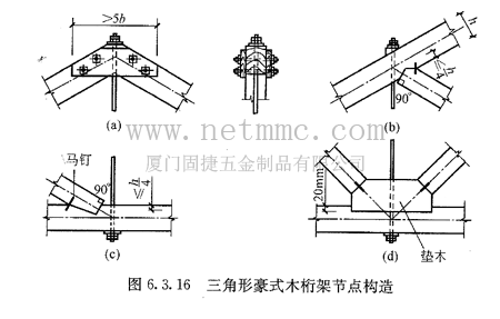 中間節(jié)點(diǎn)一般均采用單齒連接,其構(gòu)造原則與支座節(jié)點(diǎn)相同,但按毛截面對中,其刻槽深度不大于弦桿高度或直徑的1/4。一般均可采用馬釘緊固(圖6.3.16b、c)。為防止木構(gòu)件的劈裂,馬釘?shù)闹睆讲灰诉^大。當(dāng)設(shè)有懸掛吊車或有振動荷載時(shí),則宜用人字鐵及螺栓緊固。