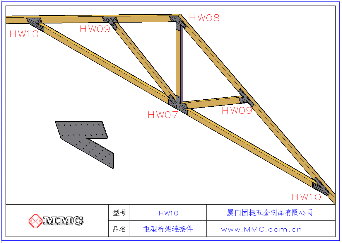 用于重型木結構房屋的桁架上,也可用于不方便采用齒板連接的輕型桁架上。尺寸需要根據(jù)實際木材規(guī)格定制