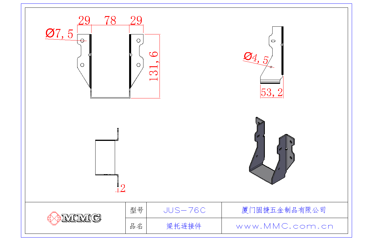 JUS-76C 梁托-U型掛件-龍骨與橫梁水平連接件-木結(jié)構(gòu)別墅金屬配件