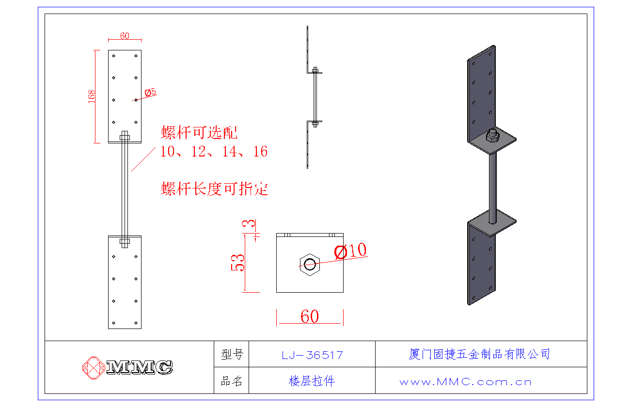 用于梁柱式結構的抗震加強連接,也可用于輕鋼建筑或輕型木結構的樓層抗拔連接。 螺桿直徑可定制10、12、14、16,長度可指定。